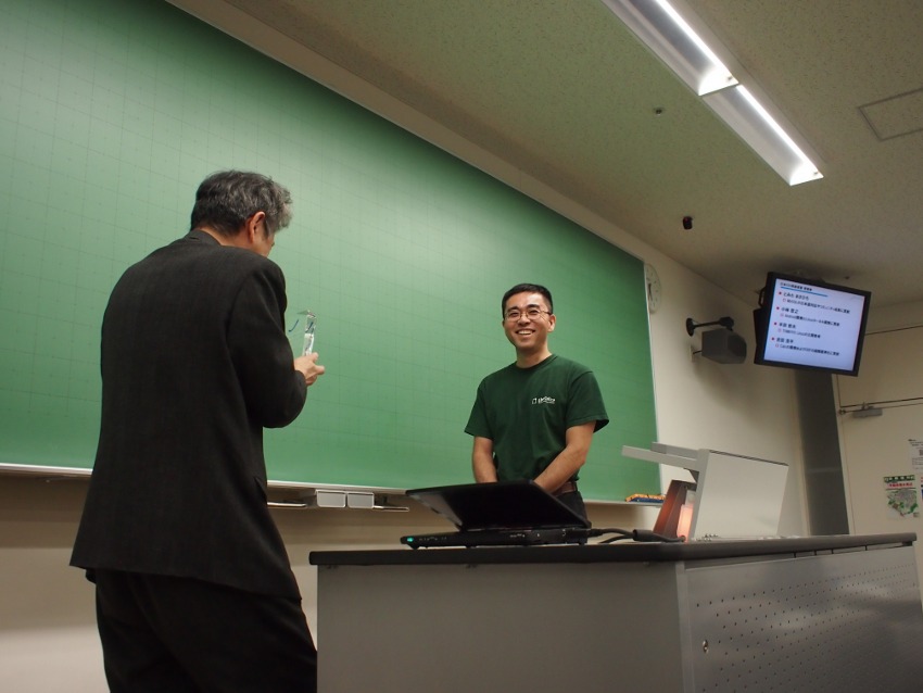 The ceremony was held in a separate, moderately-sized lecture room right next to the booth areas, and was very well attended. Out of four winners, two of us were present to receive the awards: Tetsuo Handa and myself. We each gave a brief 10-minutes talk afterward, outlining our current activities and our future plans.